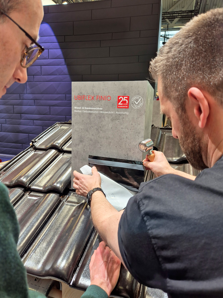 Die Teststation zog Besucher an. Sie formten Ubiflex Finio an Ziegel und Kamin. Sie testeten Haftung, Dehnverhalten und Zuschnitt. Viele erkannten erst bei der praktischen Anwendung, wie schnell sich Anschlüsse ausführen lassen. Das direkte Erleben ersetzte jede Präsentation. Gespräche entstanden aus der Anwendung heraus – offen und fachlich.